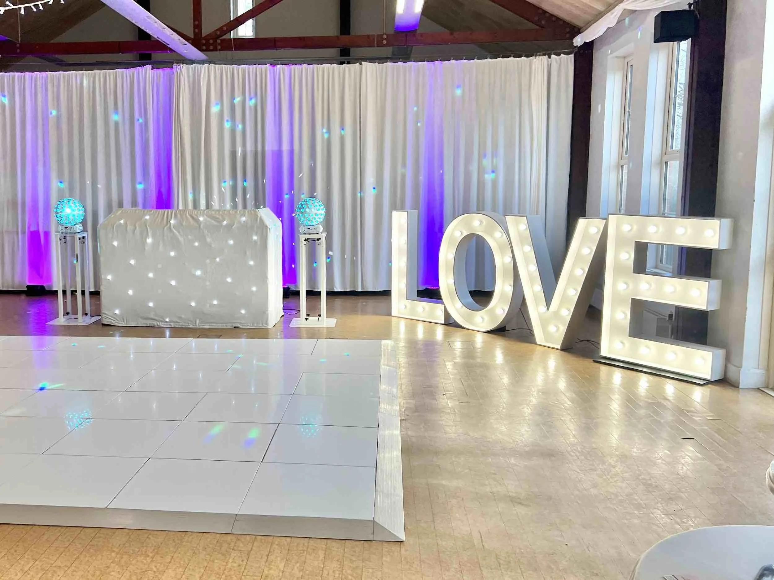 Cream Entertainment set up their white set display of DJ, Dance Floor and LOVE Letters, while their sister company Bradgate Events provided the chiavari chairs.