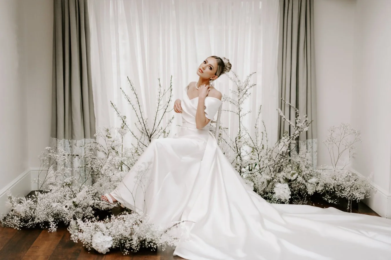 As soon as Chloe asked me to do this shoot and I saw the brief, I knew our ‘Jess’ dress by Eva Lendel would be the perfect match! She screams elegance and pairs beautifully with the minimalist vibe and monochrome colour palette. She is the ultimate classic, crafted from luxurious Mikado fabric that is both versatile and on-trend with her detachable overskirt.