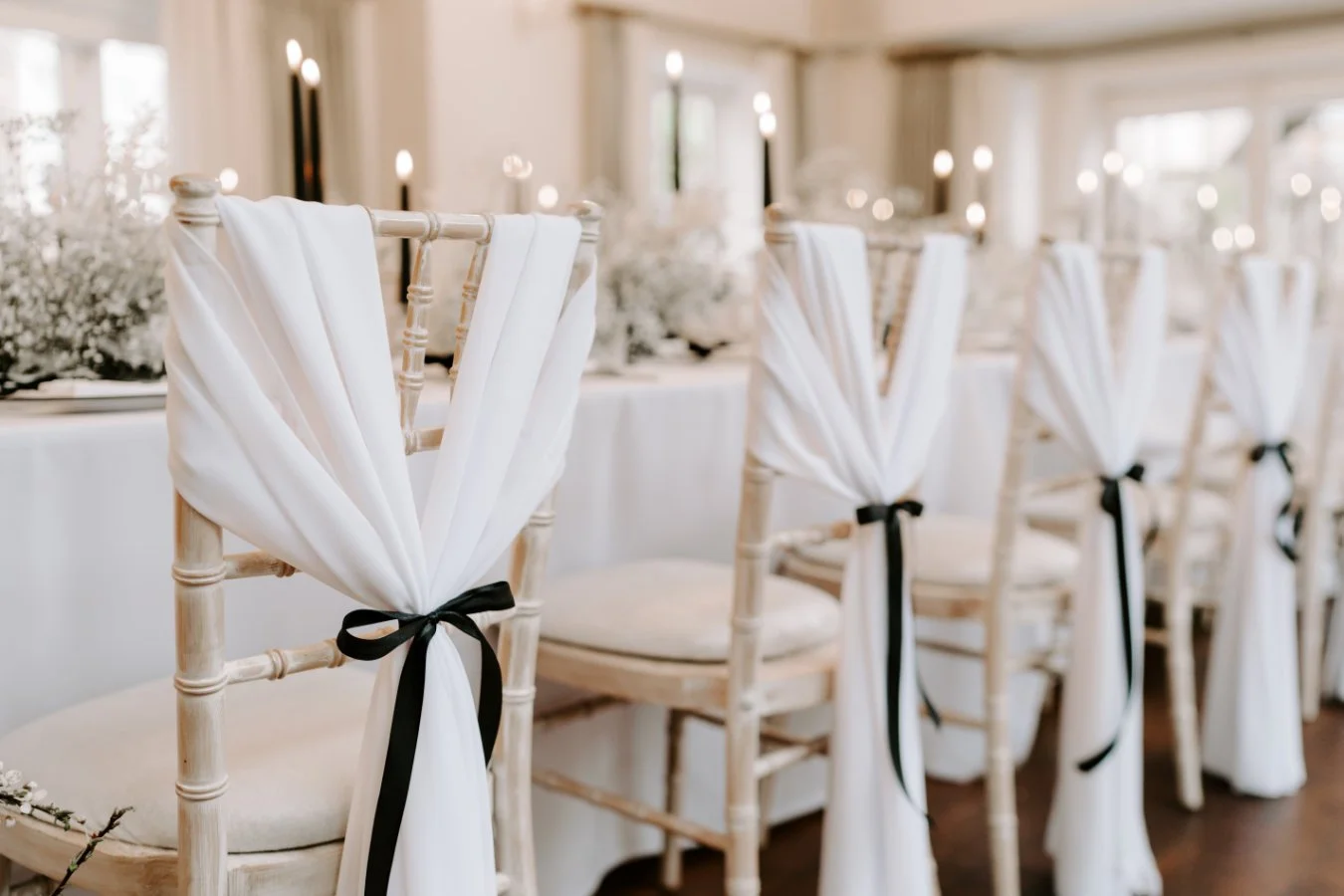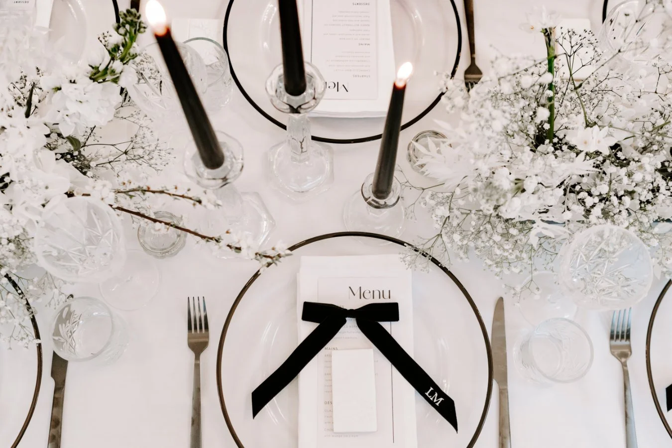 We used a mixture of classic pieces such as glass candlesticks and white draping yet added in lots of black highlights creating the trend and modern feel, with candles, candlesticks and luxe bows alongside beautiful glass charger plates.